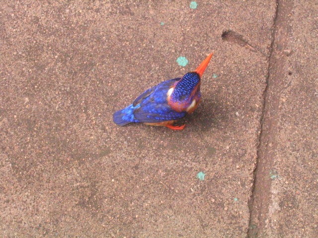 little Malachite kingfisher flew into a window. He knocked himslef out,