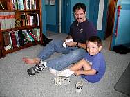 Mike's having a hard time with those darn laces - the velcro's easier, eh, Ethan?